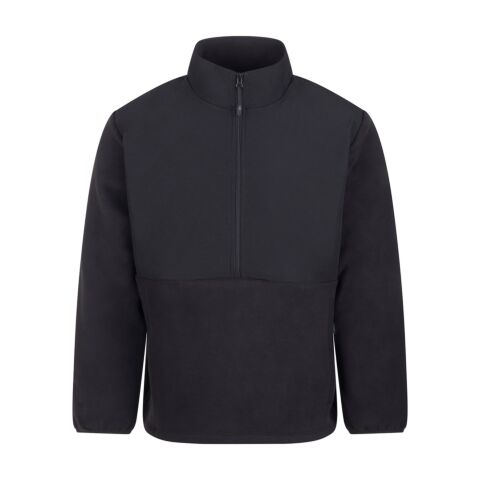 1/2-zip styling. Microfleece fabric with ripstop fabric overlay on upper torso front, back and collar. Centre front zip with bottom zip garage. Two side welt pockets with an inner kangaroo pocket. Stretch binding on the cuff opening. Adjustable hem with elastic and toggles. Tag-free for easy rebranding. Made from 100% recycled polyester.
