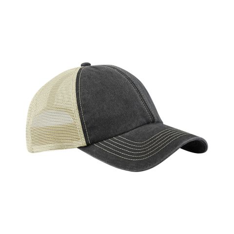 The 6-panel vintage trucker cap is edgy, with its hint of distressed retro styling. Made from heavy-washed cotton with recycled polyester mesh panels, it has a relaxed, unstructured crown and a curved peak for a classic look. Contrast stitching adds extra detail, while the snapback adjuster ensures a perfect fit. A timeless, laid-back piece with vintage appeal.