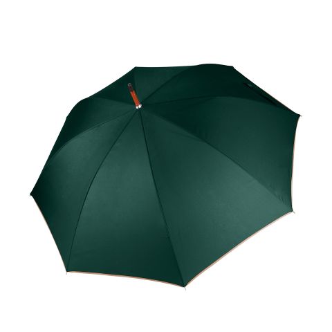 Classic wooden umbrella 23" (58.5 cm) auto opening, pongee solid fabric, black metal frame, wooden shaft, wooden J handle, white metal tips, 96 cm Ø. BSCI certified.