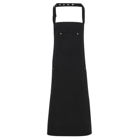 This full bib apron is designed with classic 'chino' style accents for a cool and edgy uniform solution for bars and restaurants. There are three functional pockets for design and practicality, together with a simply pop-snap button fastener to secure the neckband in place.