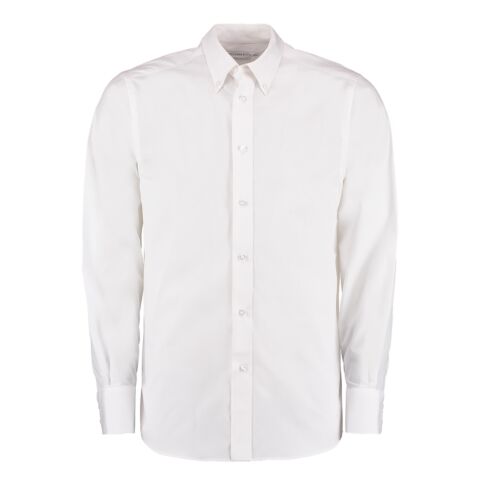 Fused stand-up button-down collar. Single needle stitched yoke and armholes. Double-stitched sleeve and side seams. Two-button cuff with no button pointed cuff placket. Back yoke. Rounded hem. Spare buttons. Kustom Kit woven back neck label.