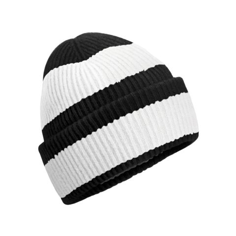 This classic knit beanie is given a youthful and graphic update with statement-making colour-blocking. The single-layer knit, made from luxury soft-touch yarn, is comfortable and warm, enhanced by a turn-up cuff and engineered crown. Contains certified recycled polyester.