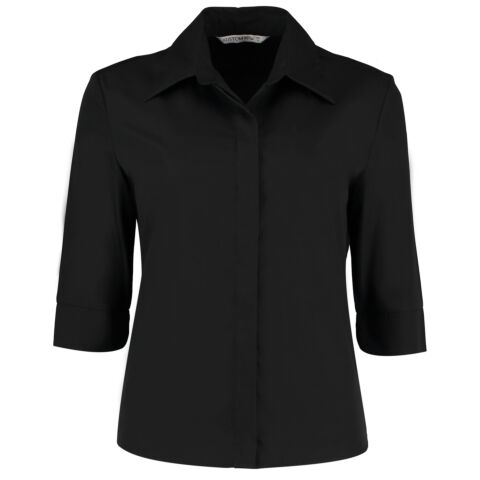 Soft interlined fused stand-up open collar. Covered front placket. Rounded hem. Side vents. Rounded cuff with vent. Centre back seam. Two back darts. Spare button. Kustom Kit woven back neck label.