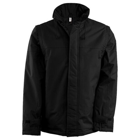 100% Polyester outer with PVC coating. Polyester padding and lining. Full-zip. Water-repellent with studded storm flap. Front pockets. Inside pocket, 1 mobile phone pocket. Detachable sleeves. Cuff adjusters with tear release fastening. Concealed hood with elasticated drawcord. Zip access for decoration. BSCI certified.