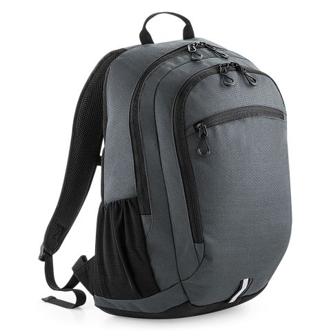 TearAway label for ease of rebranding. Laptop compatible up to 15.6". Dual compartment design. Padded laptop compartment. Reflective accents. Two mesh pockets/ water bottle holders. Zippered front pocket. Internal mesh pocket. Ergonomic padded back panel. Padded adjustable mesh shoulder straps. Adjustable chest straps. Grab handle. Reach certified.