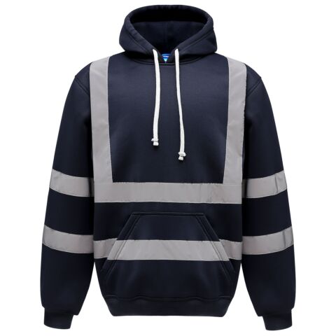 Hi-Vis conforms to EN ISO20471 Class 3; Made of water-repellent anti-pill single jersey knitted soft-feel polyester fabric; Two 5cm width reflective tapes around the body and arms, and one over each shoulder; Attached hood with draw cord adjustment; Taped back neck for extra comfort; Drop shoulder; Knitted ribbed cuffs and waistband; Front kangaroo pocket; Twin needle stitching throughout;.