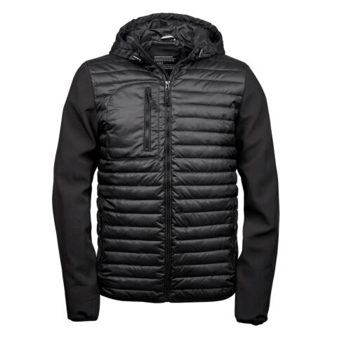 The cool Hooded crossover jacket features stunning detailing such as a chest pocket with zip and an adjustable hood, making it both practical and fashionable. For a sporty look, it combines a light polyester 300T with padding and softshell. The jacket has an adjustable hem, elastic cuffs, two side pockets and an inner pocket.