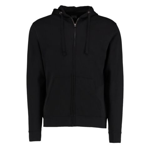 Full front zip. Self fabric lined hood. Self coloured tape to back neck, taped shoulders. Self fabric double layered cuff and welt. Double-stitched shoulders, flat lock feature seaming around armhole and top of pocket. Flat tape cord through hood, channel finished with metal eyelets. Brushed silver metal hardware. Double pocket to centre front. Kustom Kit tear-out neck label. Superwash 60° swing ticket.
