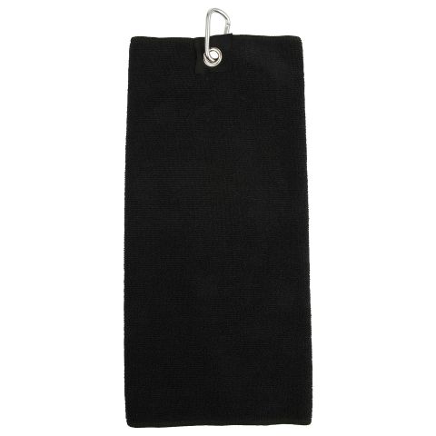 Microfibre tri-fold golf towel. Grosgrain ribbon tab with metal eyelet and snap hook attachment. Carabiner clip. Overlocked edge.