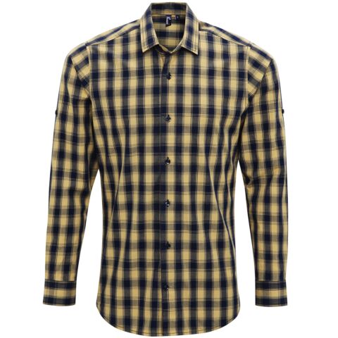 Long sleeve semi-fitted shirt for men with a multi-coloured contrast check pattern. Single button cuff and sleeve guard which is designed to be rolled up and secured in place with a button and tab on the upper arm. Soft collar styling with curved hem.