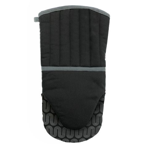 Oven mitt with silicone grip. The finger has a soft yet super-strong texture, with good slip resistance, for a firm grasp. It can easily be cleaned with warm soapy water, or machine-washed.