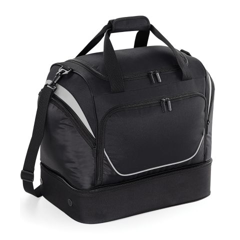 Designed to fit most lockers. Dual compartment design. Structured, ventilated base compartment. Front pocket designed for easy decoration. Zippered end pockets. Internal valuables pocket. Internal mesh pockets. Detachable adjustable shoulder strap with pad. Padded hand grip. Protective base feet.