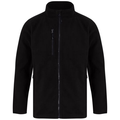 Fabric using recycled materials. Made from recycled polyester. Anti-pill microfleece. Recycled zips. Set-in sleeves. Shoulder panel. 2 single welt zipped pockets. Zipped chest pocket. Back neck tape. Back neck outer hanging loop. Full-length front zip with zip guard and facing. Non-slip zip pulls. Stretch binding on collar and cuffs. Henbury cut-out label for easy rebranding.