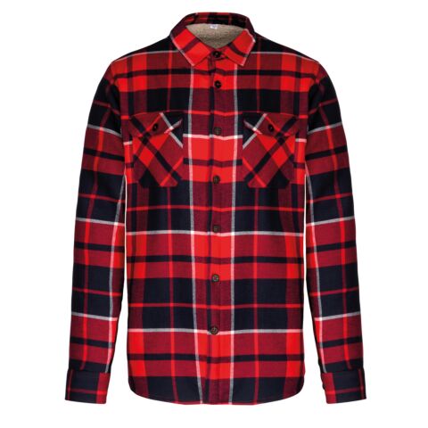100% cotton flannel. Sherpa-lined body in 100% polyester. Lined and padded sleeves in 100% polyester taffeta. Very soft and warm shirt jacket. 2 flap chest pockets. Classic button placket. Adjustable buttoned cuffs. Rounded hem. No brand label at neck, only size tag for easy relabelling. Certified STANDARD 100 by OEKO-TEX N° CQ 1007/8, IFTH.