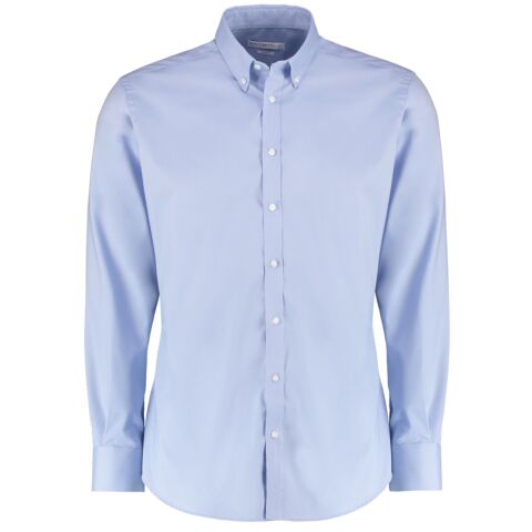 Fused stand-up button down collar. Two darts at back. Rounded hem. Back yoke. Two button cuff with buttoned cuff placket. Single stitched yoke and armhole. Spare buttons. Kustom Kit woven back neck label.