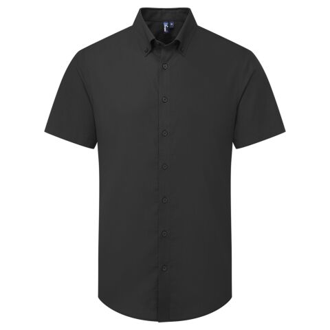 Short sleeve shirt in mercerised cotton, which enhances its overall look, feel and performance. Contains organic cotton and elastane for stretch and shape. Button-down collar. Self-coloured buttons with pearlised buttons on white. Back yoke for fit over the shoulders and back pleats to assist the shape. Curved hemline.