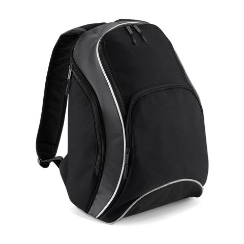 Padded adjustable shoulder straps. Enhanced visibility. Reflective piping. Zippered front pocket. Zippered side pockets. Internal mesh pocket. Water bottle pocket. Media pocket. Headphone port. Padded back panel.