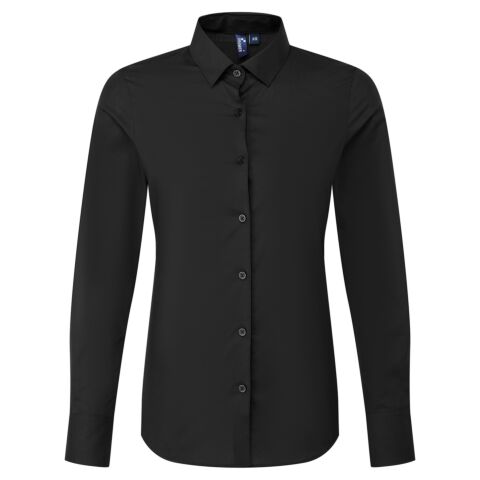 Women’s long sleeve poplin shirt made with certified recycled polyester and cotton. Soft collar styling. Full button-through with pearlised buttons on white and self-coloured on black. Two-button cuff. Sleeve guard with single button. Curved hemline and back darts for a feminine fit. Easycare fabric.