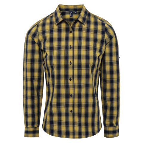 A women's long sleeve semi-fitted shirt with multi-coloured contrast check pattern. Single button cuff and sleeve guard which is designed to be rolled up and secured in place with a button and tab on the upper arm. Soft collar styling with curved hem.