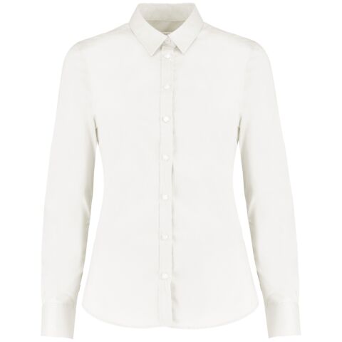 Fused stand-up collar. Two darts at the back. Two bust darts to the front. Rounded hem. Back yoke. Adjustable cuff with buttoned cuff placket. Spare button. Kustom Kit woven back neck label.