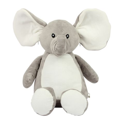 Soft plush elephant. Contrast cream inner ears, feet, and front panel. Sewn eyes. Zip access on base for direct access onto the tummy for decoration. Removable inner stuffing. Zip access to both ears for decoration onto the ears. Can be embroidered or sublimation printed. Complies with EN71 European Toy Safety regulations. Remove all hang tags and their fasteners before giving these items to a child. Suitable for children of all ages.